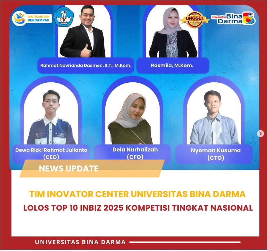 TIM INOVATOR CENTER UNIVERSITAS BINA DARMA LOLOS TOP 10 INBIZ 2025 KOMPETISI TINGKAT NASIONAL