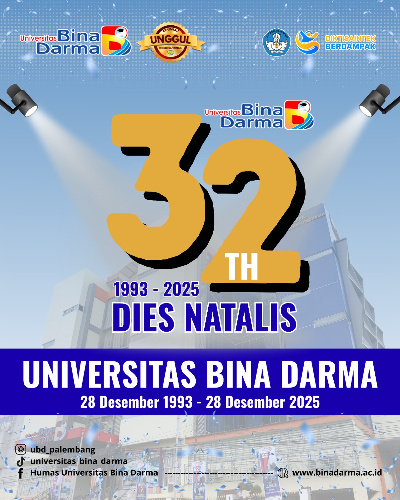 SELAMAT DIES NATALIS UNIVERSITAS BINA DARMA YANG KE-32 Posted by Humas2 UBD Categories Berita Date January 6, 2026 Comments 0 comment Share: Humas2 UBD Previous post SELAMAT KEPADA UNIVERSITAS BINA DARMA TELAH MERAIH RANK 66 ASEAN 2026 DAN RANK 171-190 ALL ASIA 2026 PADA APPLIEDHE PUBLIC & PRIVATE UNIVERSITY RANKING. January 6, 2026 Next post NEWSLETTER EDISI DESEMBER 2025 January 6, 2026 You may also like PERPUSTAKAAN UBD GANDENG SMK PGRI 2 PALEMBANG PERKUAT LITERASI DAN AKSES DIGITAL 23 January, 2026 SELAMAT & SUKSES 22 January, 2026 TERIMA KASIH ATAS PENGABDIANNYA 22 January, 2026