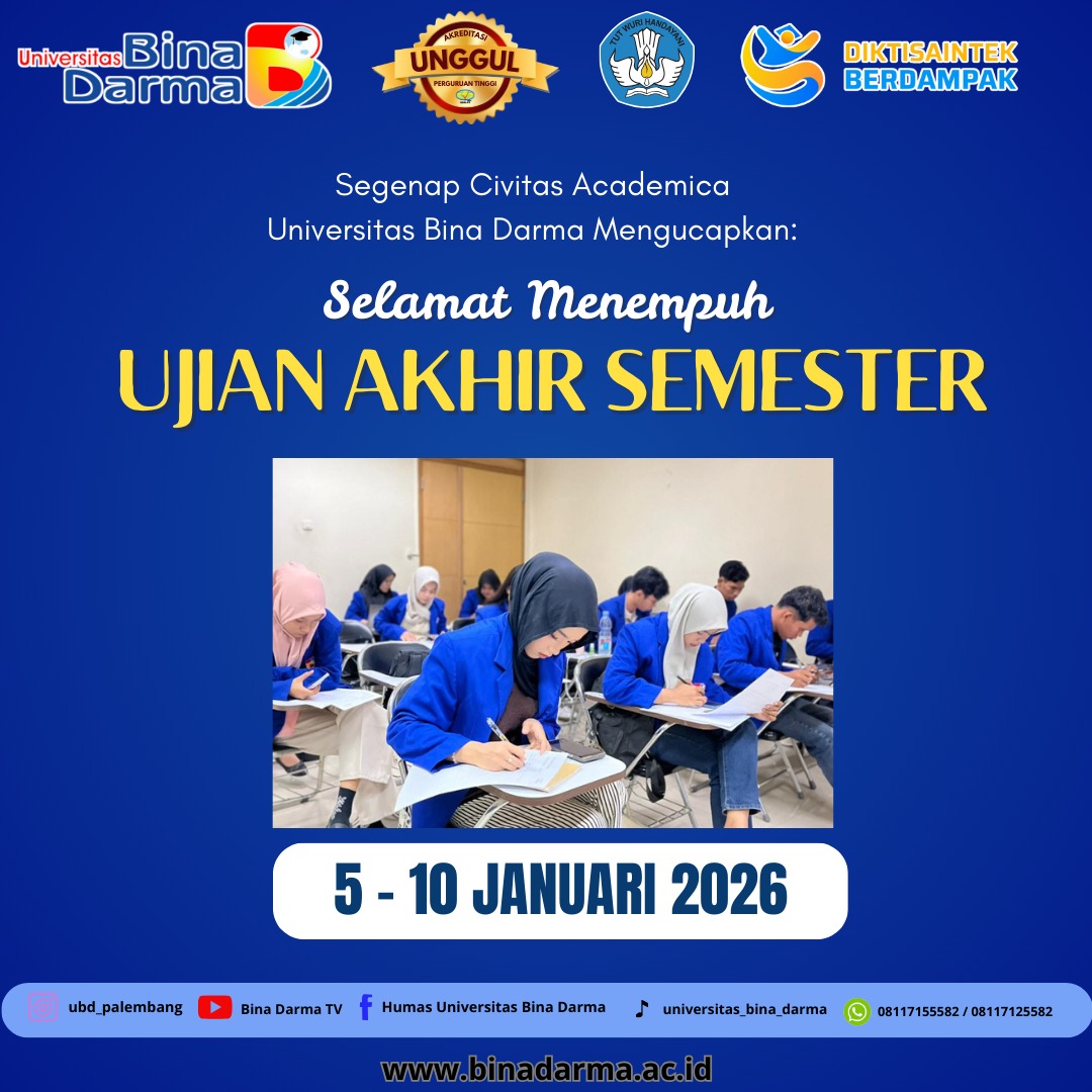 SELAMAT MENEMPUH UJIAN AKHIR SEMESTER 5-10 JANUARI 2026 Posted by Humas2 UBD Categories Berita Date January 6, 2026 Comments 0 comment Share: Humas2 UBD Previous post SELAMAT TAHUN BARU 2026 January 6, 2026 Next post SELAMAT DAN SUKSES KEPADA 8 DOSEN UNIVERSITAS BINA DARMA ATAS PENCAPAIAN KENAIKAN JABATAN AKADEMIK MENJADI LEKTOR KEPALA January 6, 2026 You may also like PERPUSTAKAAN UBD GANDENG SMK PGRI 2 PALEMBANG PERKUAT LITERASI DAN AKSES DIGITAL 23 January, 2026 SELAMAT & SUKSES 22 January, 2026 TERIMA KASIH ATAS PENGABDIANNYA 22 January, 2026