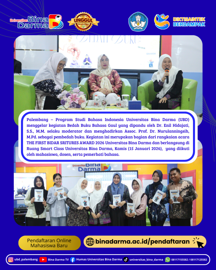 Palembang – Program Studi Bahasa Indonesia Universitas Bina Darma (UBD) menggelar kegiatan Bedah Buku Bahasa Gaul yang dipandu oleh Dr. Enil Hidajati, S.S., M.M. selaku moderator dan menghadirkan Assoc. Prof. Dr. Nurulanningsih, M.Pd. sebagai pembedah buku. Kegiatan ini merupakan bagian dari rangkaian acara THE FIRST BIDAR SRITURES AWARD 2026 Universitas Bina Darma dan berlangsung di Ruang Smart Class Universitas Bina Darma, Kamis (15 Januari 2026), yang diikuti oleh mahasiswa, dosen, serta pemerhati bahasa.