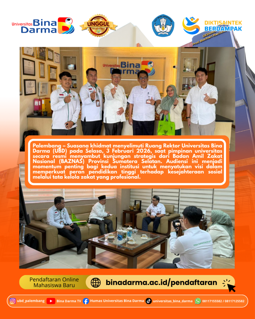 Palembang – Suasana khidmat menyelimuti Ruang Rektor Universitas Bina Darma (UBD) pada Selasa, 3 Februari 2026, saat pimpinan universitas secara resmi menyambut kunjungan strategis dari Badan Amil Zakat Nasional (BAZNAS) Provinsi Sumatera Selatan. Audiensi ini menjadi momentum penting bagi kedua institusi untuk menyatukan visi dalam memperkuat peran pendidikan tinggi terhadap kesejahteraan sosial melalui tata kelola zakat yang profesional.