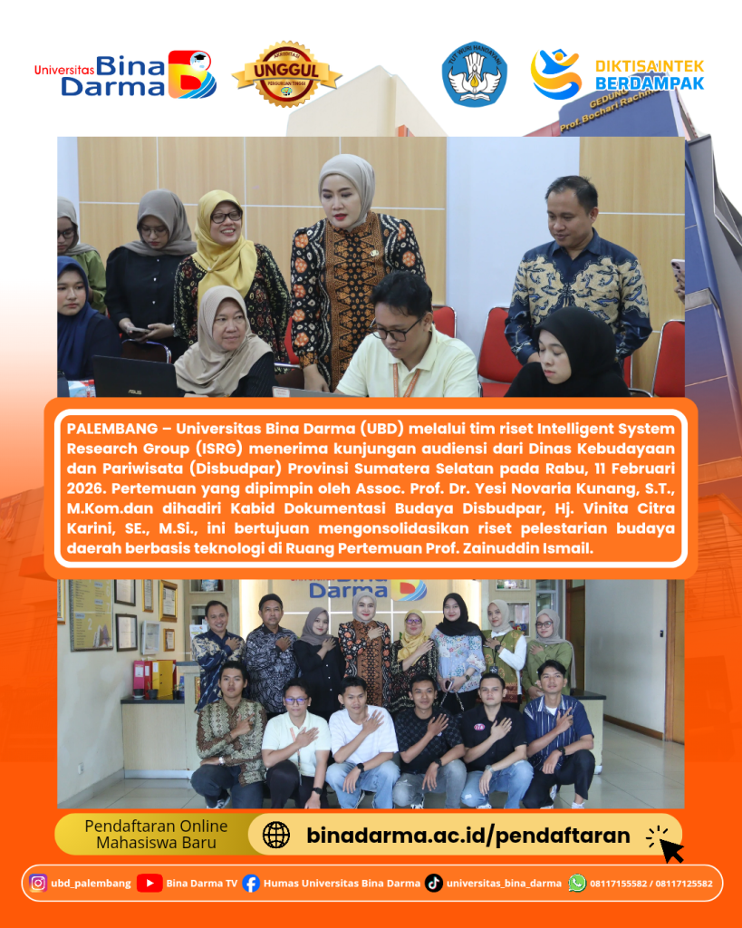 PALEMBANG – Universitas Bina Darma (UBD) melalui tim riset Intelligent System Research Group (ISRG) menerima kunjungan audiensi dari Dinas Kebudayaan dan Pariwisata (Disbudpar) Provinsi Sumatera Selatan pada Rabu, 11 Februari 2026. Pertemuan yang dipimpin oleh Assoc. Prof. Dr. Yesi Novaria Kunang, S.T., M.Kom. dan dihadiri Kabid Dokumentasi Budaya Disbudpar, Hj. Vinita Citra Karini, SE., M.Si., ini bertujuan mengonsolidasikan riset pelestarian budaya daerah berbasis teknologi di Ruang Pertemuan Prof. Zainuddin Ismail.