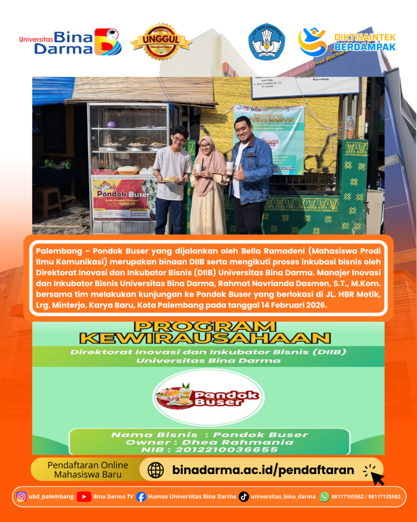 Palembang – Pondok Buser yang dijalankan oleh Bella Ramadeni (Mahasiswa Prodi Ilmu Komunikasi) merupakan binaan DIIB serta mengikuti proses inkubasi bisnis oleh Direktorat Inovasi dan Inkubator Bisnis (DIIB) Universitas Bina Darma. Manajer Inovasi dan Inkubator Bisnis Universitas Bina Darma, Rahmat Novrianda Dasmen, S.T., M.Kom. bersama tim melakukan kunjungan ke Pondok Buser yang berlokasi di JL. HBR Motik, Lrg. Minterjo, Karya Baru, Kota Palembang pada tanggal 14 Februari 2026.