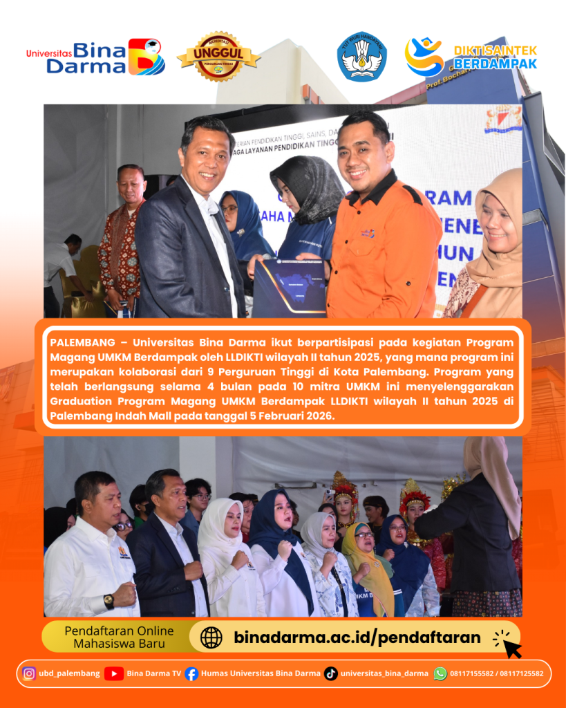 Palembang – Universitas Bina Darma ikut berpartisipasi pada kegiatan Program Magang UMKM Berdampak oleh LLDIKTI wilayah II tahun 2025, yang mana program ini merupakan kolaborasi dari 9 Perguruan Tinggi di Kota Palembang. Program yang telah berlangsung selama 4 bulan pada 10 mitra UMKM ini menyelenggarakan Graduation Program Magang UMKM Berdampak LLDIKTI wilayah II tahun 2025 di Palembang Indah Mall pada tanggal 5 Februari 2026.