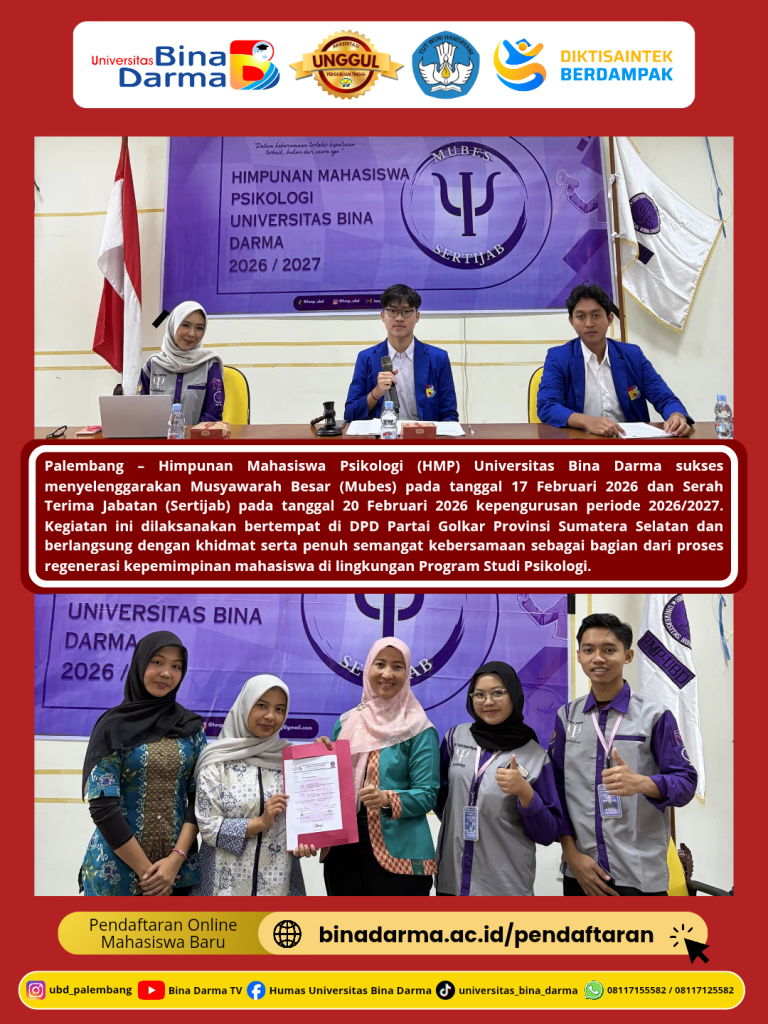 Palembang – Himpunan Mahasiswa Psikologi (HMP) Universitas Bina Darma sukses menyelenggarakan Musyawarah Besar (Mubes) pada tanggal 17 Februari 2026 dan Serah Terima Jabatan (Sertijab) pada tanggal 20 Februari 2026 kepengurusan periode 2026/2027. Kegiatan ini dilaksanakan bertempat di DPD Partai Golkar Provinsi Sumatera Selatan dan berlangsung dengan khidmat serta penuh semangat kebersamaan sebagai bagian dari proses regenerasi kepemimpinan mahasiswa di lingkungan Program Studi Psikologi.