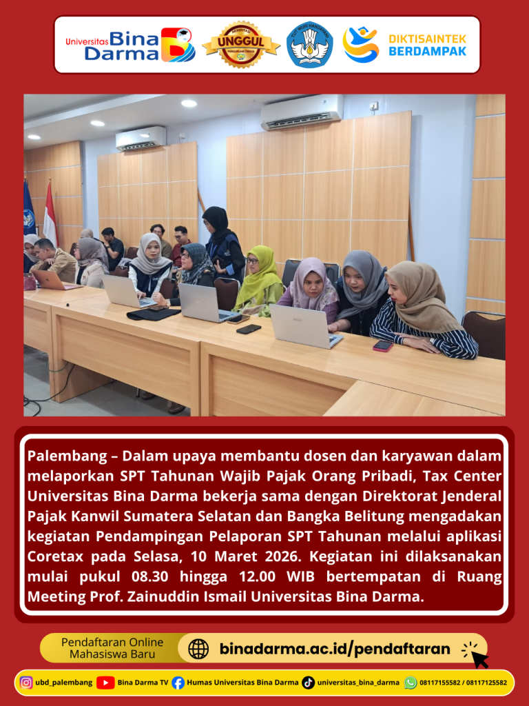 Palembang – Dalam upaya membantu dosen dan karyawan dalam melaporkan SPT Tahunan Wajib Pajak Orang Pribadi, Tax Center Universitas Bina Darma bekerja sama dengan Direktorat Jenderal Pajak Kanwil Sumatera Selatan dan Bangka Belitung mengadakan kegiatan Pendampingan Pelaporan SPT Tahunan melalui aplikasi Coretax pada Selasa, 10 Maret 2026.