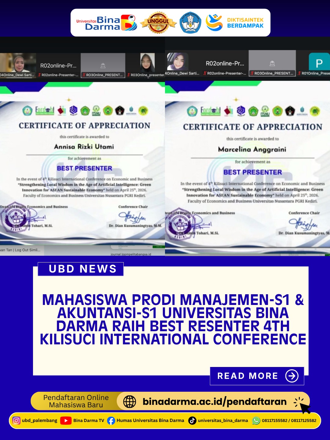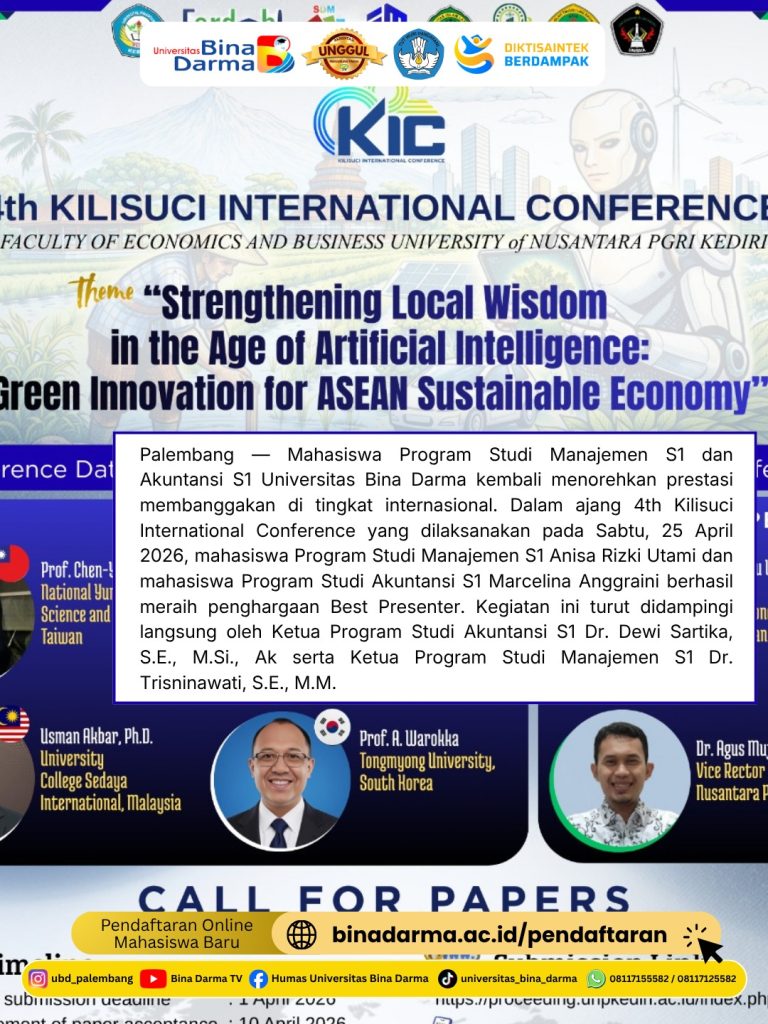 Palembang — Mahasiswa Program Studi Manajemen S1 dan Akuntansi S1 Universitas Bina Darma kembali menorehkan prestasi membanggakan di tingkat internasional. Dalam ajang 4th Kilisuci International Conference yang dilaksanakan pada Sabtu, 25 April 2026, mahasiswa Program Studi Manajemen S1 Anisa Rizki Utami dan mahasiswa Program Studi Akuntansi S1 Marcelina Anggraini berhasil meraih penghargaan Best Presenter. Kegiatan ini turut didampingi langsung oleh Ketua Program Studi Akuntansi S1 Dr. Dewi Sartika, S.E., M.Si., Ak serta Ketua Program Studi Manajemen S1 Dr. Trisninawati, S.E., M.M.