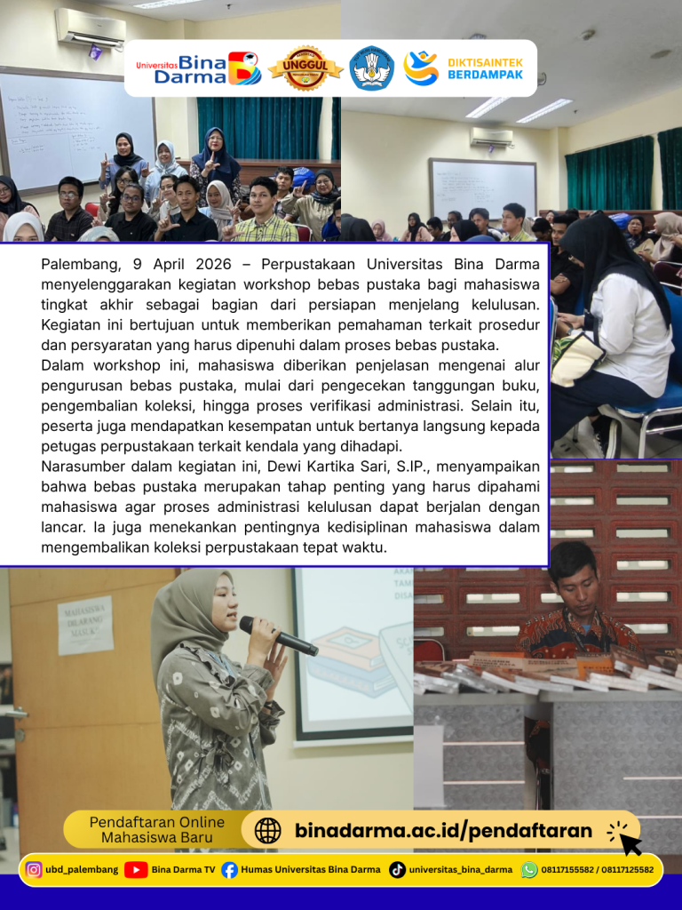 Palembang, 9 April 2026 – Perpustakaan Universitas Bina Darma menyelenggarakan kegiatan workshop bebas pustaka bagi mahasiswa tingkat akhir sebagai bagian dari persiapan menjelang kelulusan. Kegiatan ini bertujuan untuk memberikan pemahaman terkait prosedur dan persyaratan yang harus dipenuhi dalam proses bebas pustaka.