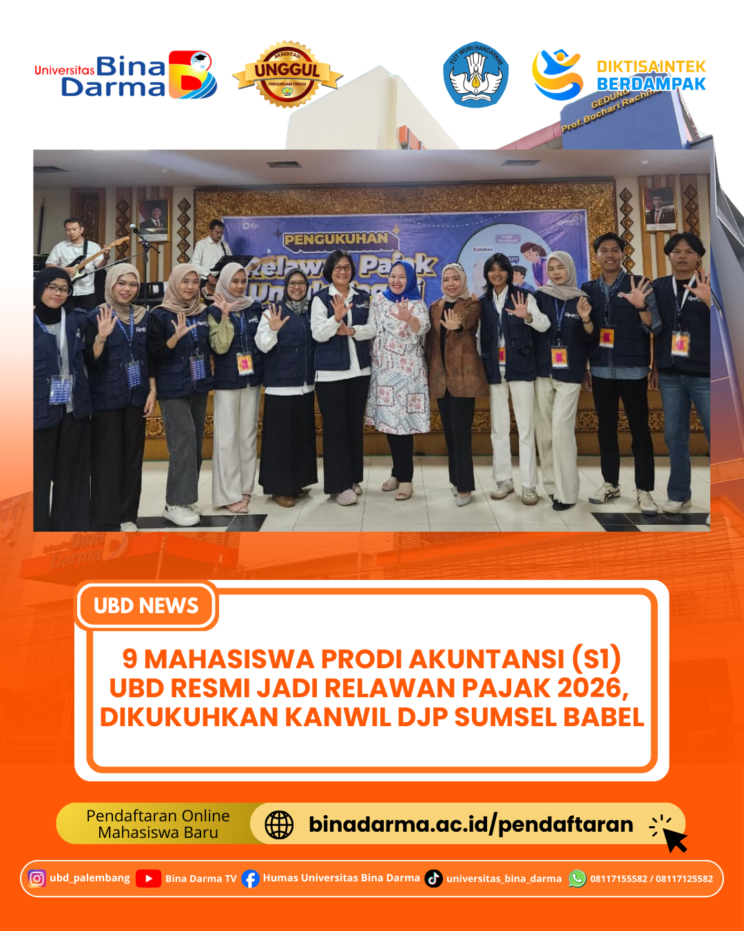 Palembang – Universitas Bina Darma (UBD) kembali menorehkan prestasi dalam keterlibatan aktif di bidang perpajakan. Sebanyak 9 mahasiswa UBD secara resmi dikukuhkan sebagai Relawan Pajak Tahun 2026 pada Senin, 2 Februari 2026, di Aula Lantai 5 Kantor Wilayah Direktorat Jenderal …