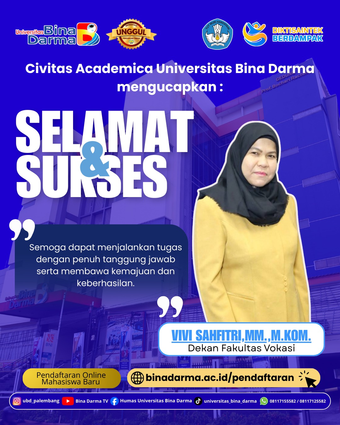 PALEMBANG – Universitas Bina Darma resmi melantik Ibu Vivi Sahfitri, M.M., M.Kom. sebagai Dekan Fakultas Vokasi yang baru. Ucapan selamat dan doa mengalir bagi dimulainya babak baru di bawah kepemimpinan beliau. Penunjukan Ibu Vivi Sahfitri diharapkan dapat membawa semangat baru …