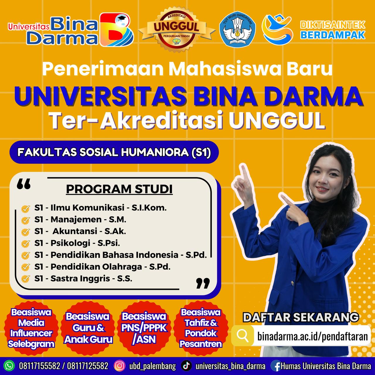 FAKULTAS SOSIAL HUMANIORA (S1), KAPAN LAGI KULIAH DI KAMPUS KREATIF DAN INOVATIF, DAN DAPATKAN BEASISWA, SEGERA BERGABUNG DI UNIVERSITAS BINA DARMA BERMUTU Fakultas Sosial Humaniora S1 – Ilmu Komunikasi S1 – Manajemen S1 – Akuntansi S1 – Psikologi S1 – …