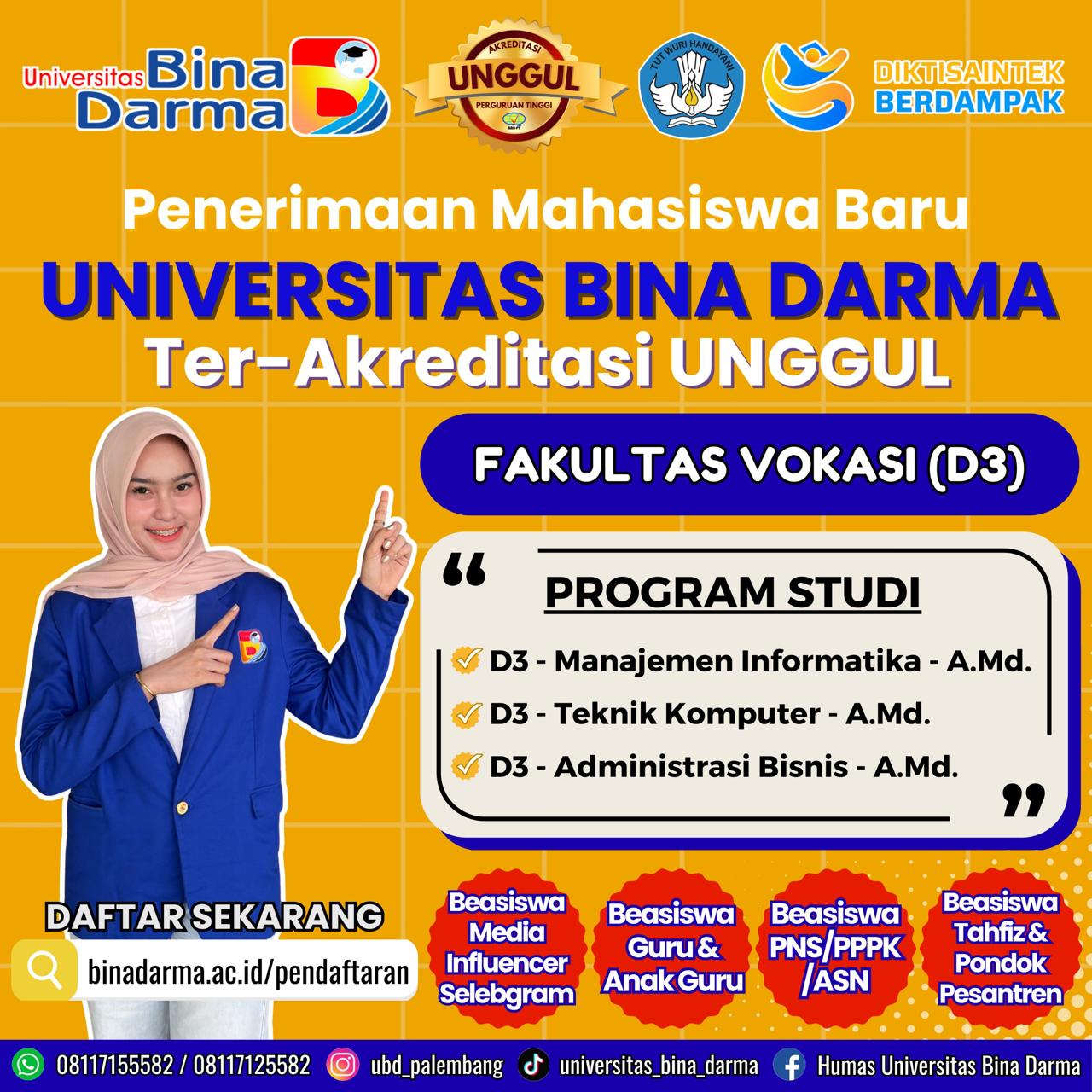 Fakultas Vokasi (D3), Kapan Lagi Kuliah di Kampus Kreatif dan Inovatif, dan Dapatkan Beasiswa, Segera bergabung di Universitas Bina Darma Bermutu D3 – Manajemen Informatika D3 – Teknik Komputer D3 – Administrasi Bisnis