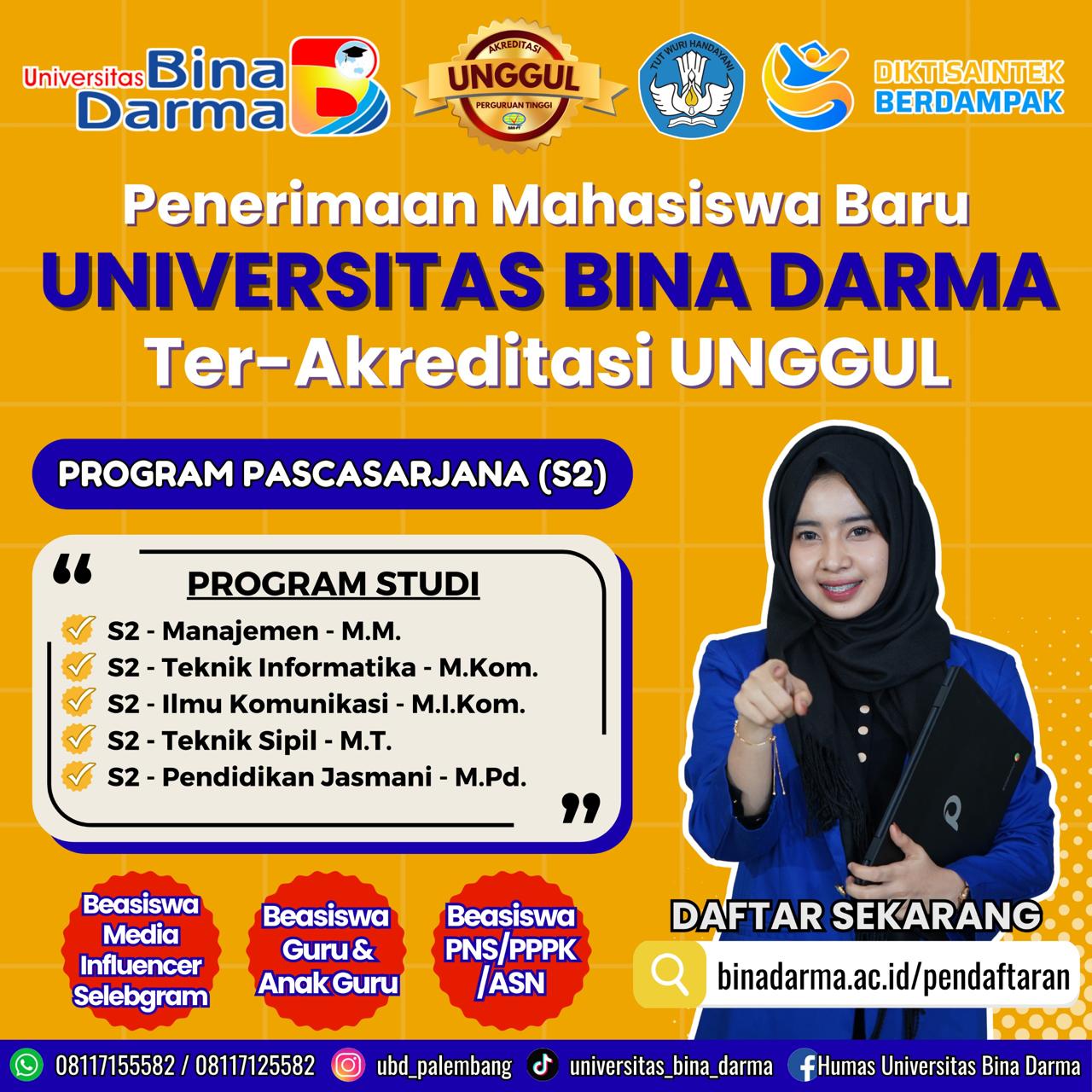 Program Pascasarjana (S2), Kapan Lagi Kuliah di Kampus Kreatif dan Inovatif, dan Dapatkan Beasiswa, Segera bergabung di Universitas Bina Darma Bermutu S2 – Manajemen S2 – Teknik Informatika S2 – Ilmu Komunikasi S2 – Teknik Sipil S2 – Pendidikan Jasmani