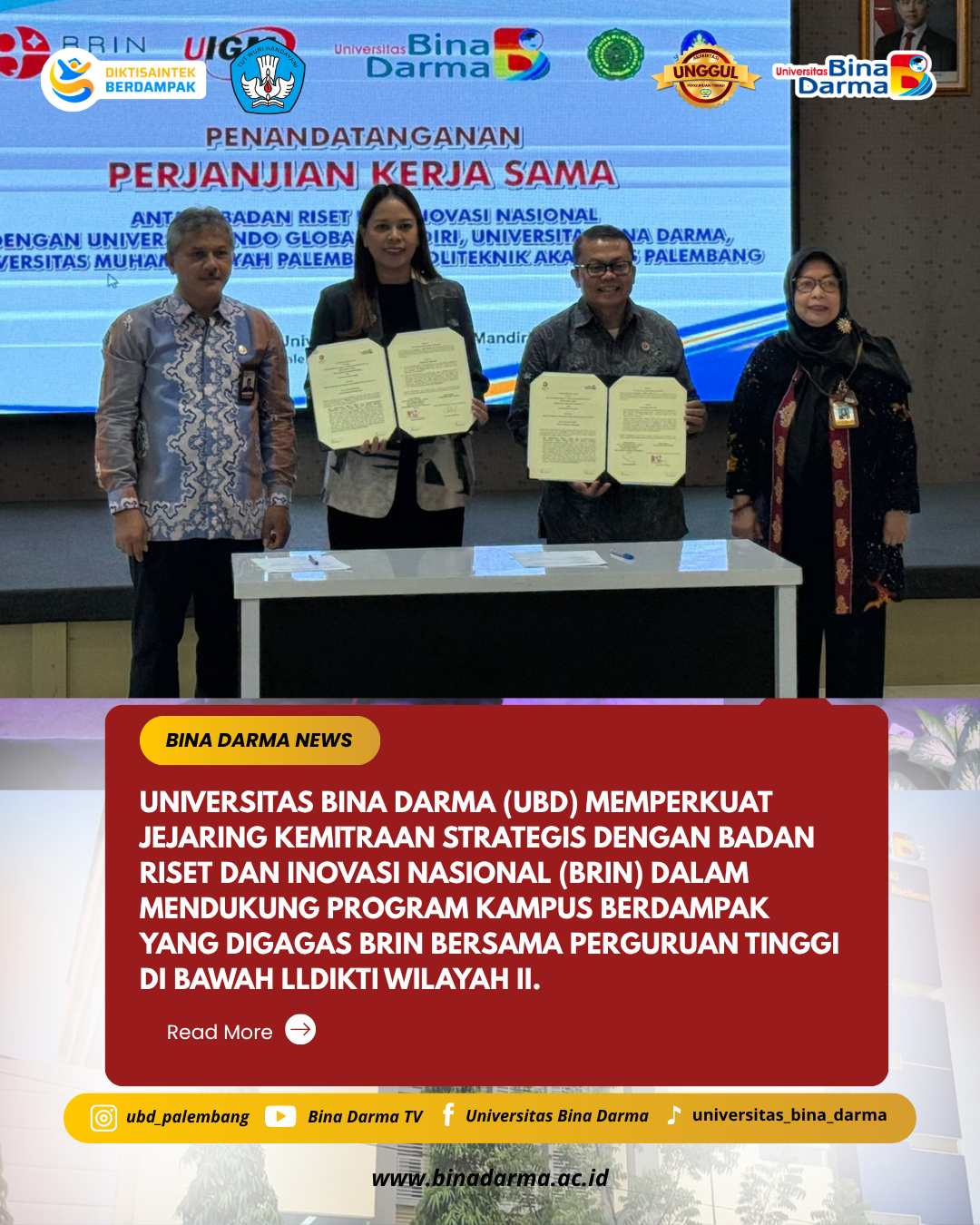 Universitas Bina Darma (UBD) memperkuat jejaring kemitraan strategis dengan Badan Riset dan Inovasi Nasional (BRIN) dalam mendukung program Kampus Berdampak yang digagas BRIN bersama perguruan tinggi di bawah LLDIKTI Wilayah II. Penandatanganan Perjanjian Kerja Sama (PKS) ini berlangsung di Kampus …