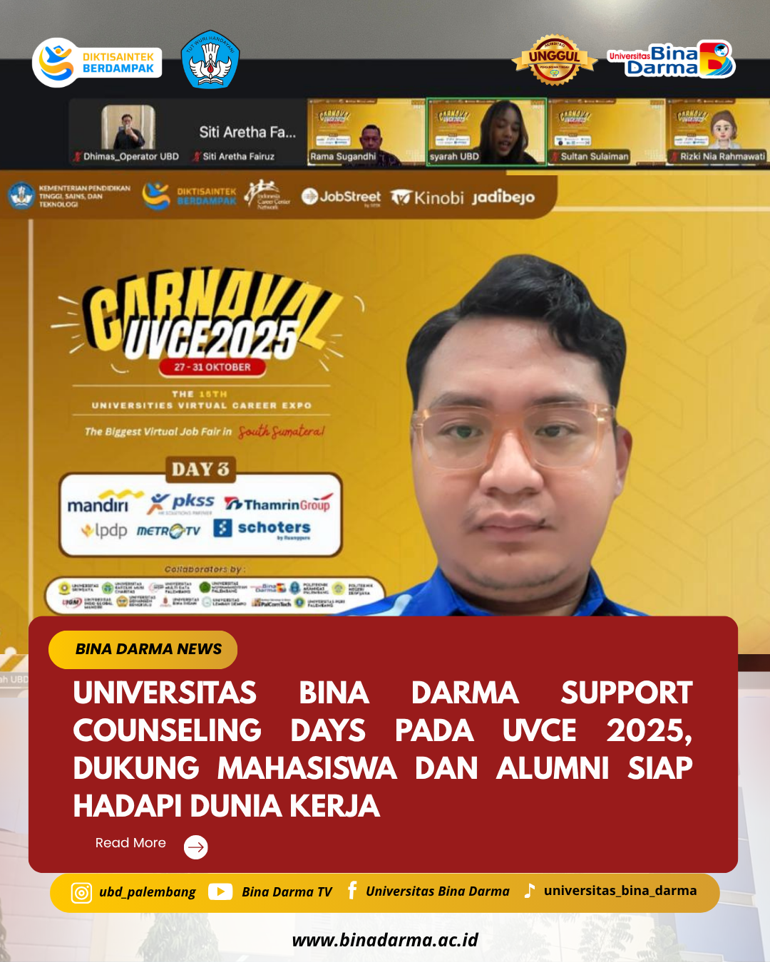 Palembang, Oktober 2025 – Universitas Bina Darma (UBD) terus menunjukkan komitmennya dalam mendukung pengembangan karier mahasiswa dan alumni. UBD berpartisipasi aktif dalam kegiatan Universities Virtual Career Expo (UVCE) tahun 2025 dengan menghadirkan program unggulan Counseling Days, yang berlangsung pada 27-31 …