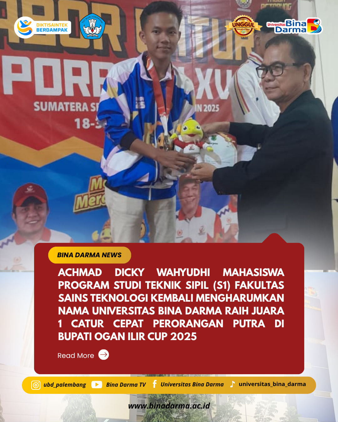 Palembang, Agustus 2025 – Prestasi membanggakan kembali diraih oleh mahasiswa Universitas Bina Darma (UBD). Achmad Dicky Wahyudhi, mahasiswa berprestasi berhasil keluar sebagai Juara 1 Catur Cepat Perorangan Putra pada ajang Bupati Ogan Ilir Cup 2025 yang berlangsung pada 11–12 Agustus …