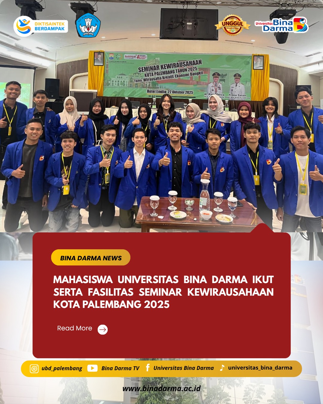 Pemerintahan Kota Palembang memberikan fasilitas Seminar Kewirausahaan bagi Mahasiswa sebagai bekal berwirausaha. Direktur Direktorat Inovasi dan Inkubator Bisnis (DIIB) Universitas Bina Darma, Rahmat Novrianda Dasmen, S.T., M.Kom. menugaskan sebanyak 20 Mahasiswa Universitas Bina Darma dari berbagai Program Studi untuk ikut …