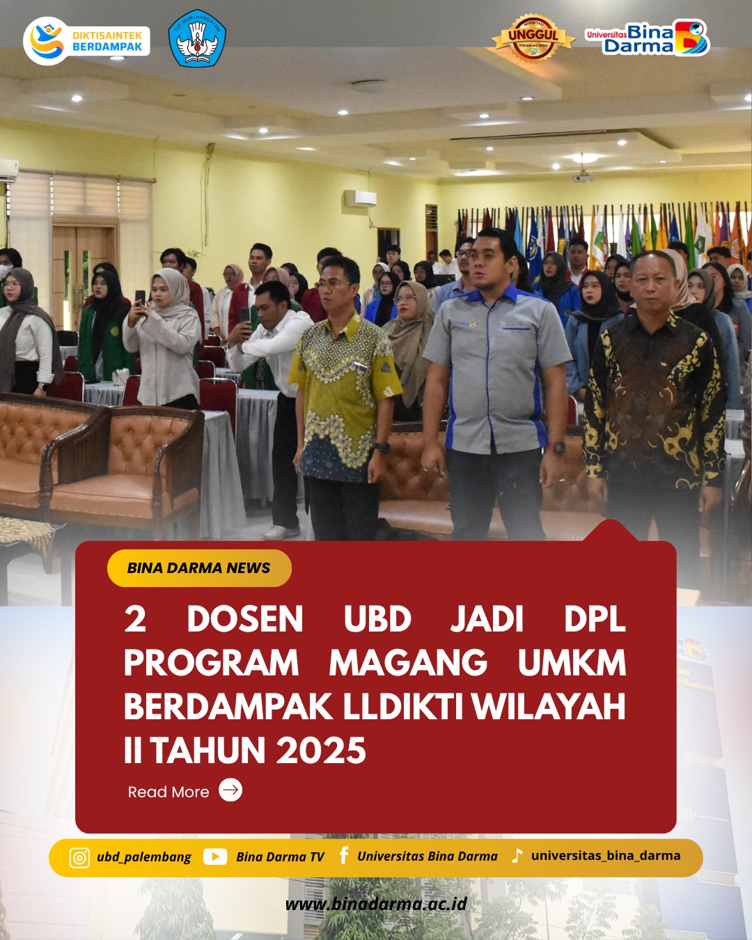 Universitas Bina Darma (UBD) kembali diberikan kepercayaan dari Lembaga Layanan Pendidikan Tinggi (LLDIKTI) wilayah II. Kali ini 2 Dosen UBD, Rahmat Novrianda Dasmen, S.T., M.Kom. dan Dr. Rizki Amaliyah, S.Psi.I., MA.Si. ditunjuk menjadi Dosen Pembimbing Lapangan (DPL) pada Program Magang …