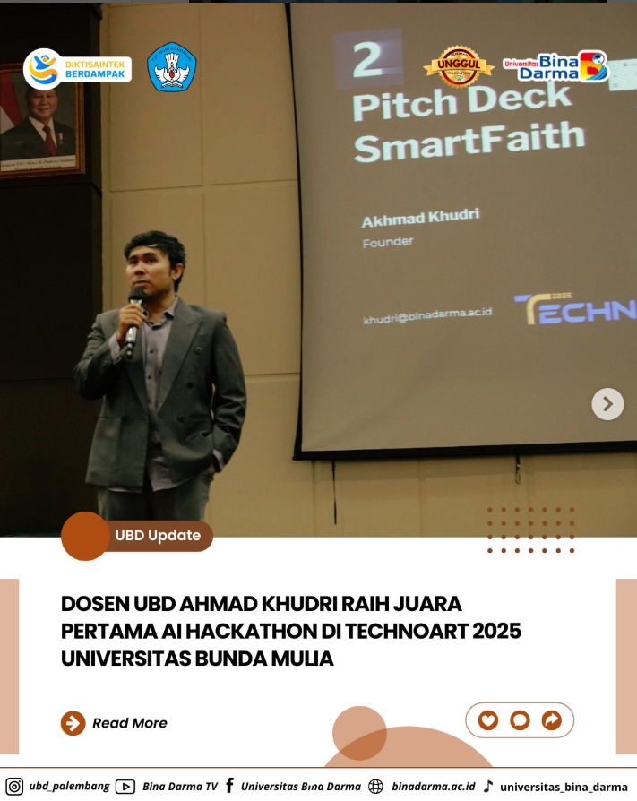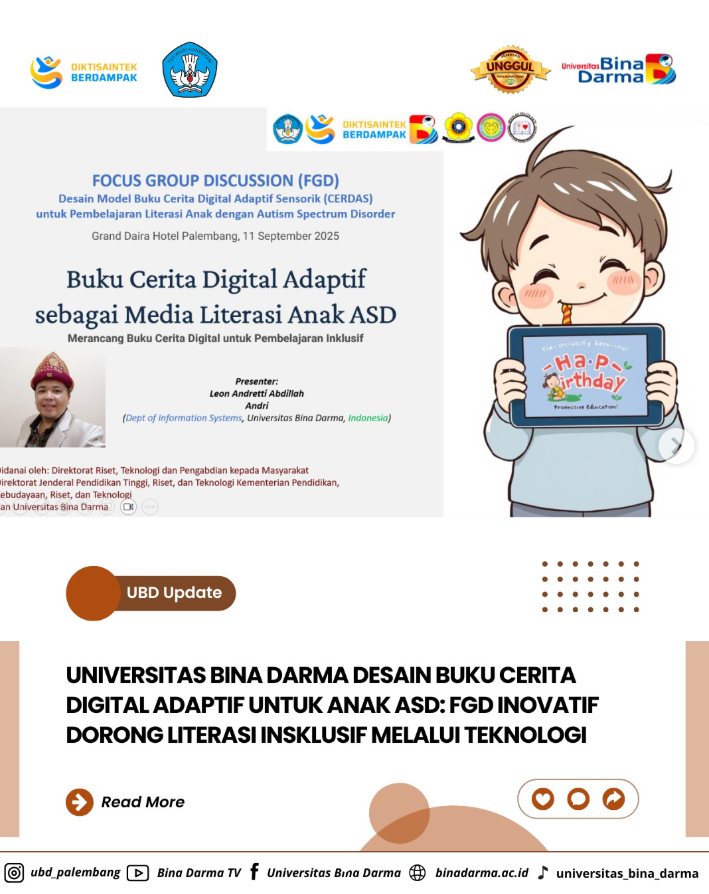 Palembang – Universitas Bina Darma (UBD) melalui Pusat Penelitian Inovasi TIK, Smart Systems, & Data Science (PUSLIT TIK) telah melaksanakan Focus Group Discussion (FGD) dalam rangka mengembangkan proyek penelitian bertajuk “Desain Model Buku Cerita Digital Adaptif Sensorik (CERDAS) untuk Pembelajaran …