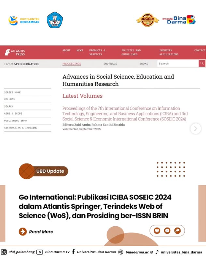 Palembang, 16 September 2025 – Melengkapi kesuksesan Konferensi 7th ICIBA dan 3rd SOSEIC 2024 yang telah diselenggarakan oleh Universitas Bina Darma (UBD) tahun 2024 lalu, artikel para peserta telah dipublikasi pada International Proceeding ATLANTIS (Part of Springer) pada series : …