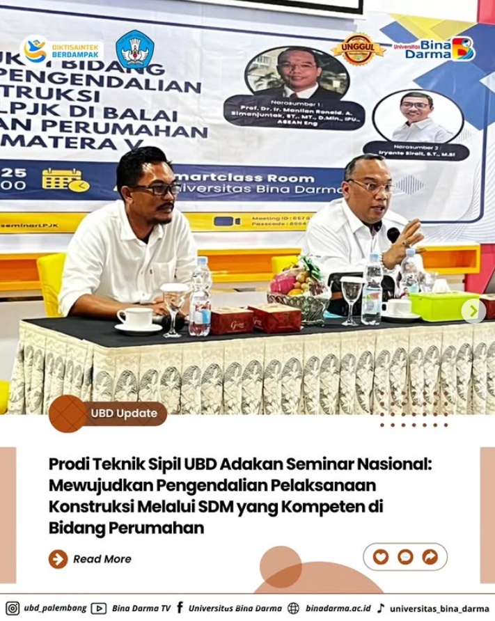 Palembang – Universitas Bina Darma menjadi tuan rumah untuk Seminar Nasional yang bertajuk “Peran SDM Konstruksi Bidang Perumahan dalam Pengendalian Pelaksanaan Konstruksi Melalui Dukungan LPJK Di Balai Pelaksana Penyediaan Perumahan dan Permukiman Sumatera V.” Kegiatan yang berlangsung pada hari Jumat …