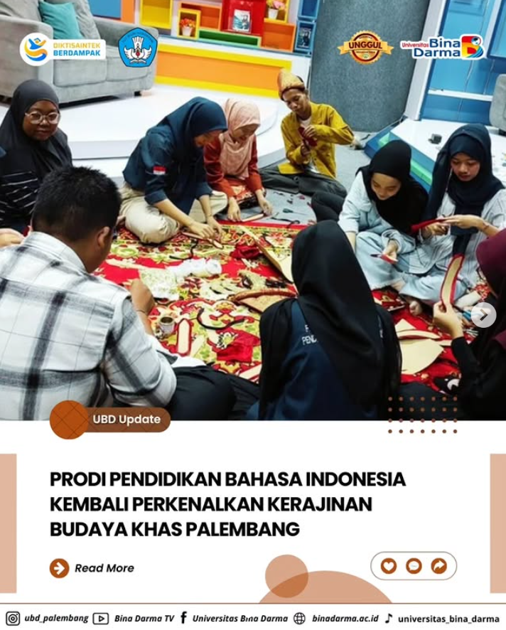 Palembang – Program Studi Pendidikan Bahasa Indonesia Universitas Bina Darma kembali melaksanakan kegiatan pengenalan budaya melalui kerajinan khas Palembang dalam rangkaian program akademik dan pengayaan mahasiswa. Kegiatan ini menjadi bagian dari upaya Prodi Pendidikan Bahasa Indonesia untuk menjaga, melestarikan, sekaligus …
